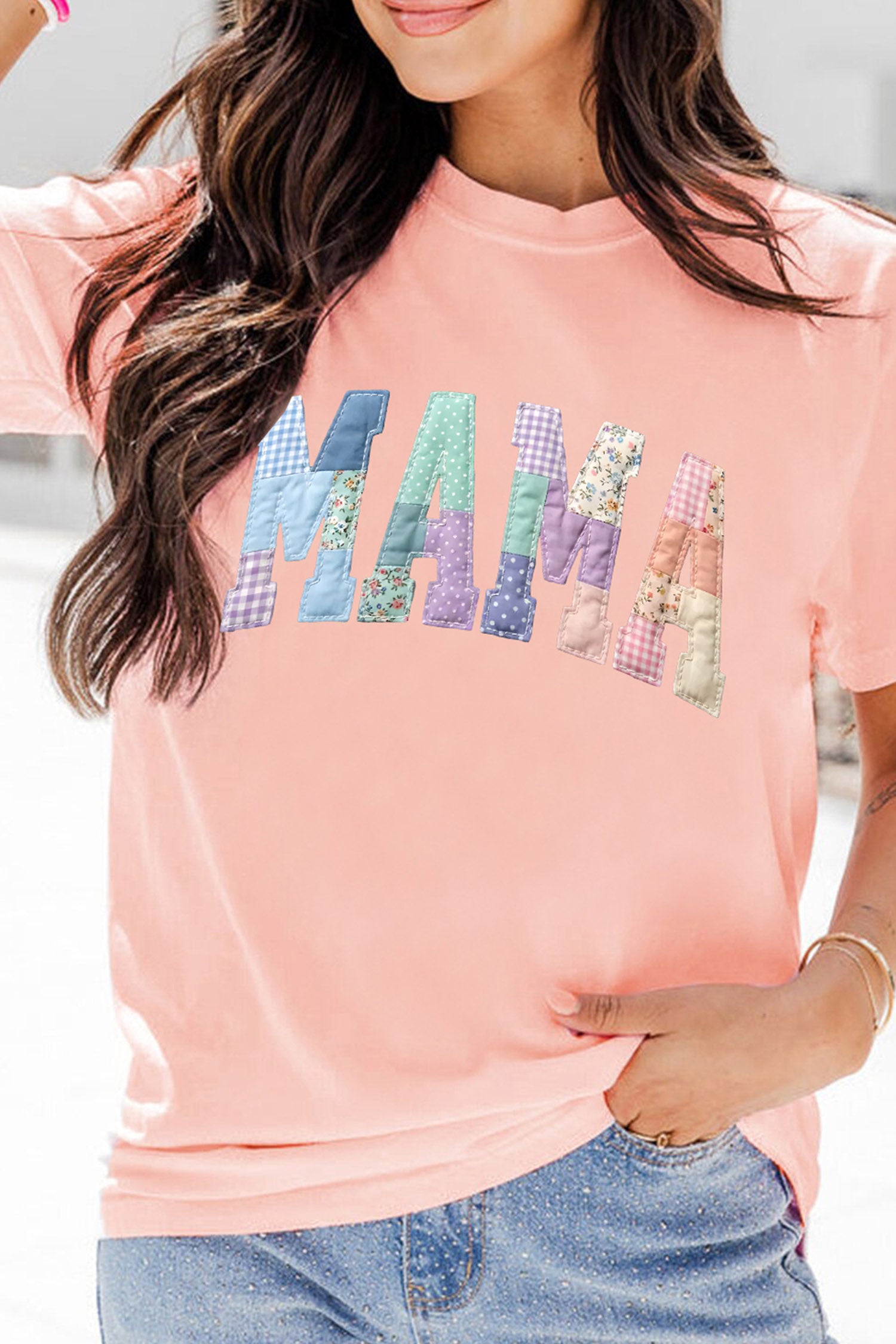 Pink Faux Patchwork Print Floral MAMA Lettering T Shirt Mother’s Day